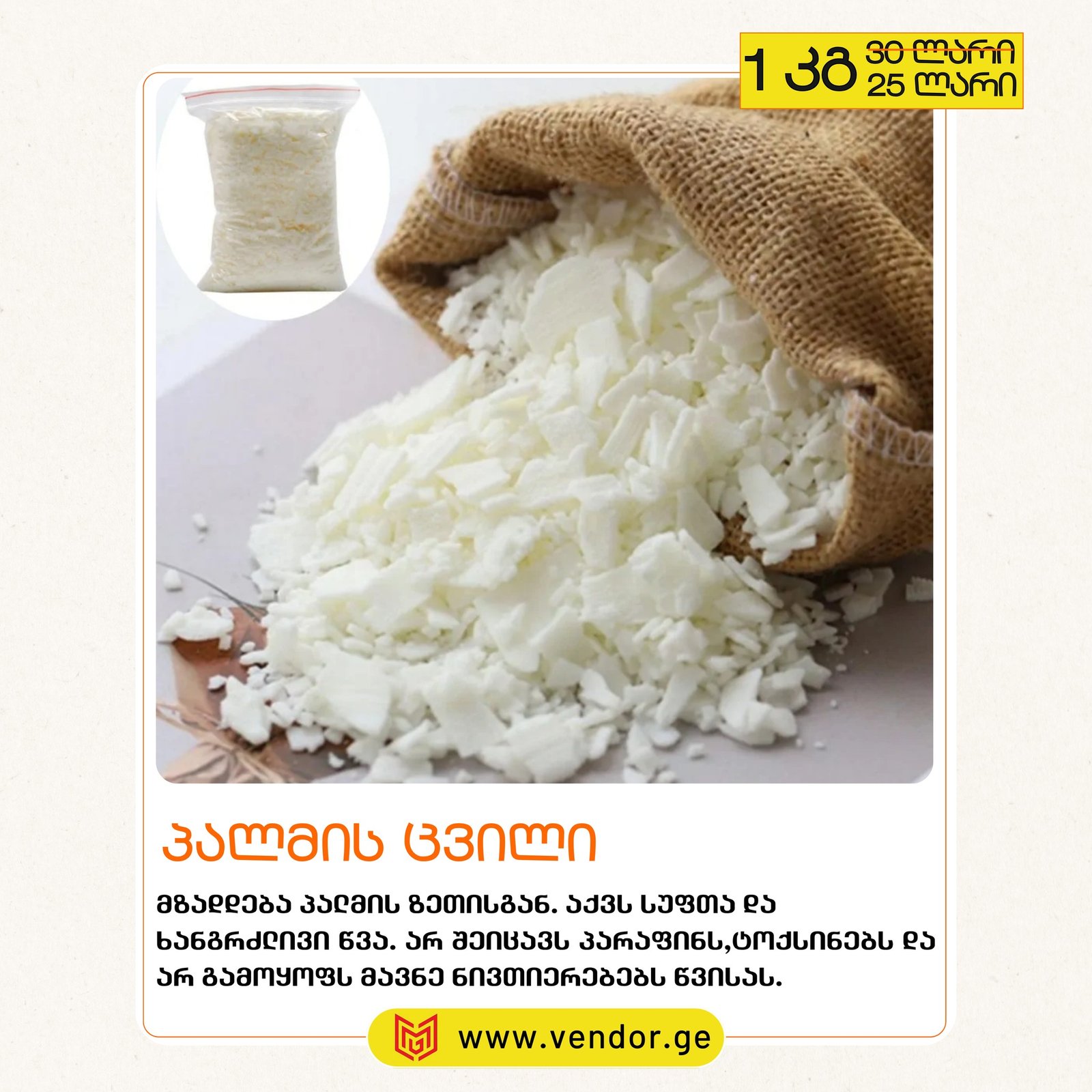 პალმის ცვილი გამოირჩევა სტაბილურობით, ხანგრძლივი წვის უნარითა და მსუბუქი სურნელით. იდეალურია ხელნაკეთი სანთლებისა და დეკორატიული სანთლების დასამზადებლად.